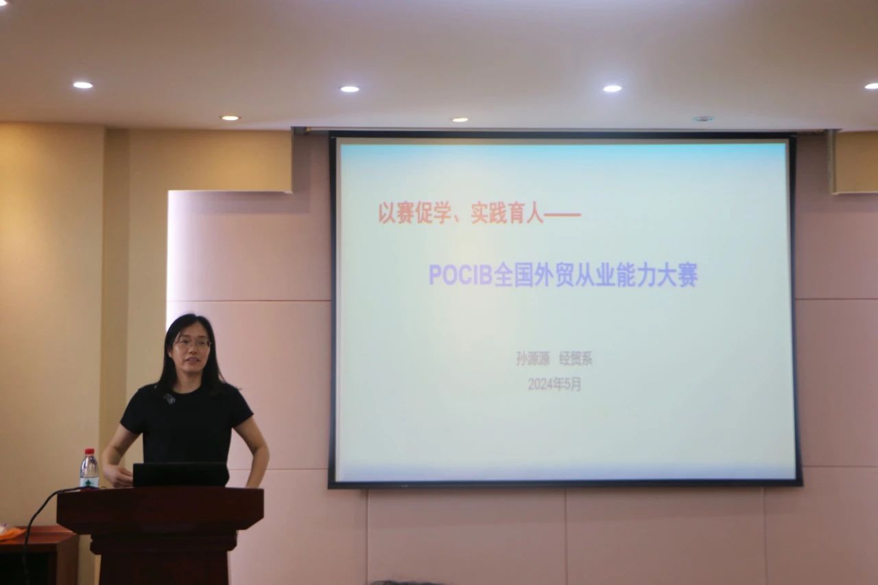 孙源源老师为大家介绍了“POCIB全国外贸从业能力大赛”及我院13年来在此项大赛中取得的成效。POCIB大赛由中国国际贸易学会主办,是专业领域内参赛人数最多、影响力最大的赛事之一。近年来,我院学子积极参与并屡获佳绩,充分展现了我院国贸专业的学子在这一赛事中的核心竞争力。希望更多的同学踊跃报名参赛,以赛促学、以赛促练,构建对国际贸易相关工作的系统性认识,深入体验外贸企业运作的全过程,在实战和竞技中提升实践操作和实践技能。