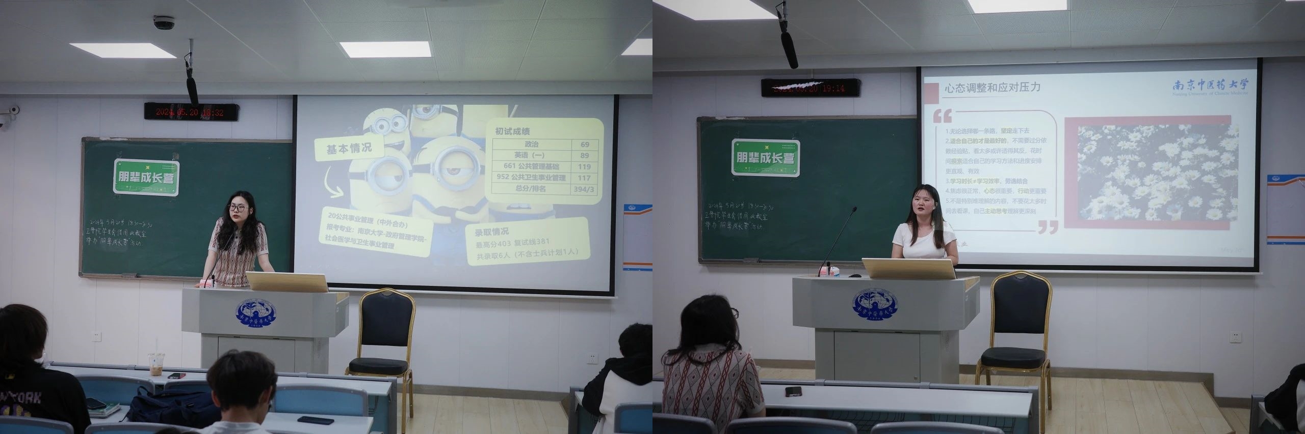 5月20日下午,太阳集团7237网站考研经验交流会在B11-312展开,本期的分享嘉宾是20公管1欧阳语嫣、20公管3姜小琴两位同学。欧阳语嫣同学先是给大家简单介绍了个人履历,接着从政治、英语、专业课方面对考研备考进行讲解,同学们表示收获颇丰。备战考研是个漫长的过程,她提醒同学们要设定目标、坚定信念、拒绝比较、合理休息,并祝愿考研的同学们都水到渠成。姜小琴同学结合个人考研经历给大家主要分享了考研心态的调整方式与应对压力的解决办法。考研是一场持久战,而心态则是战胜的关键因素。姜小琴同学向大家分享了自己的备考节奏,强调了平衡的重要性,提醒大家注重心态调节与自我激励,还分享了自己保持心态的小方法,并衷心地希望大家能够相信自己,调整心态,为梦想加油!