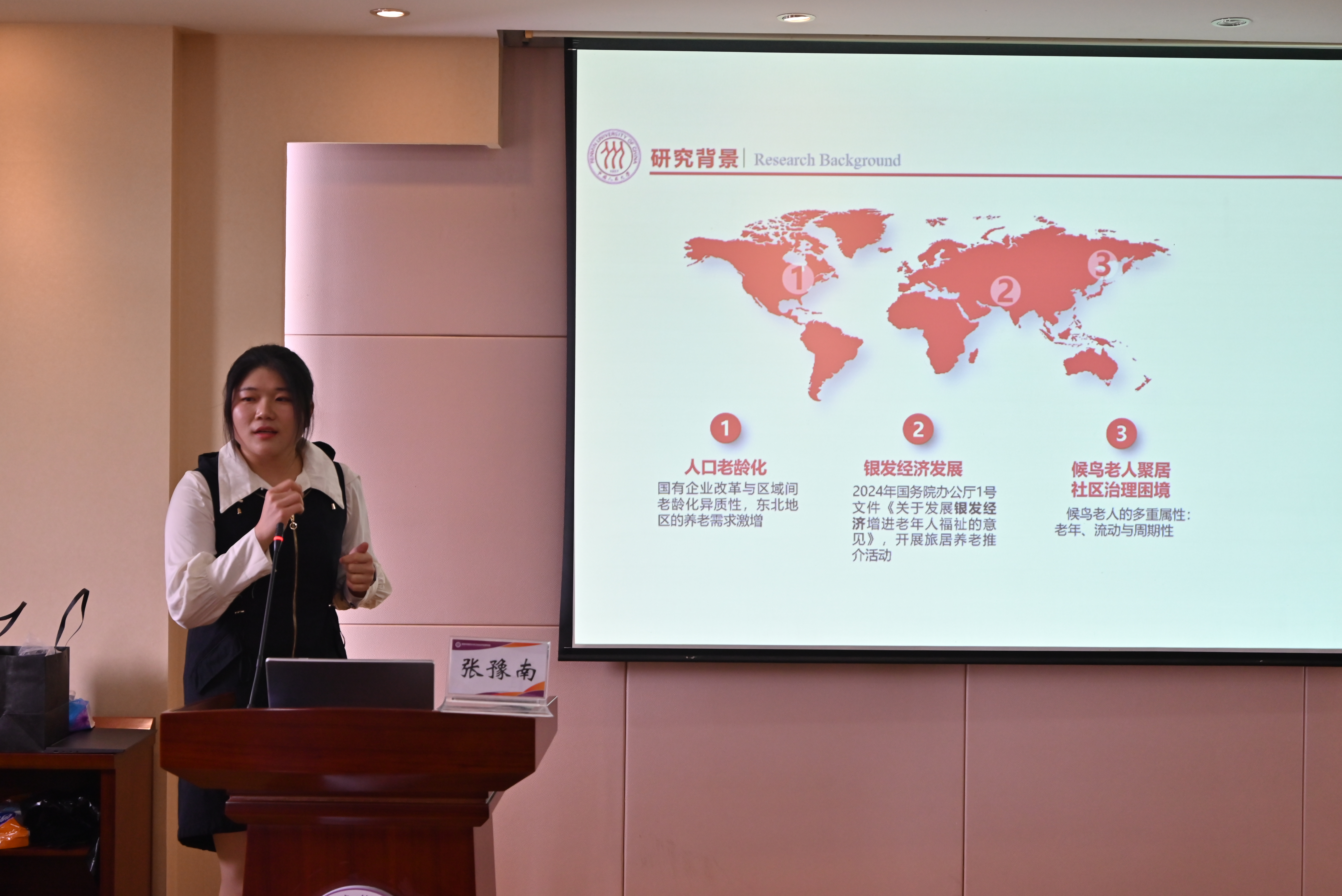 张豫南博士以《空间生产中的主体行动:“候鸟式”养老人口聚居社区治理研究》为题,向与会师生介绍了“候鸟式”养老的相关概念、研究问题及方法运用。她从“候鸟式”养老人口聚居社区冲突的社会现象提出问题,将空间生产理论嵌入到多元主体如何协同治理分析中,并以此为理论框架深挖候鸟老人聚居社区的治理机制。