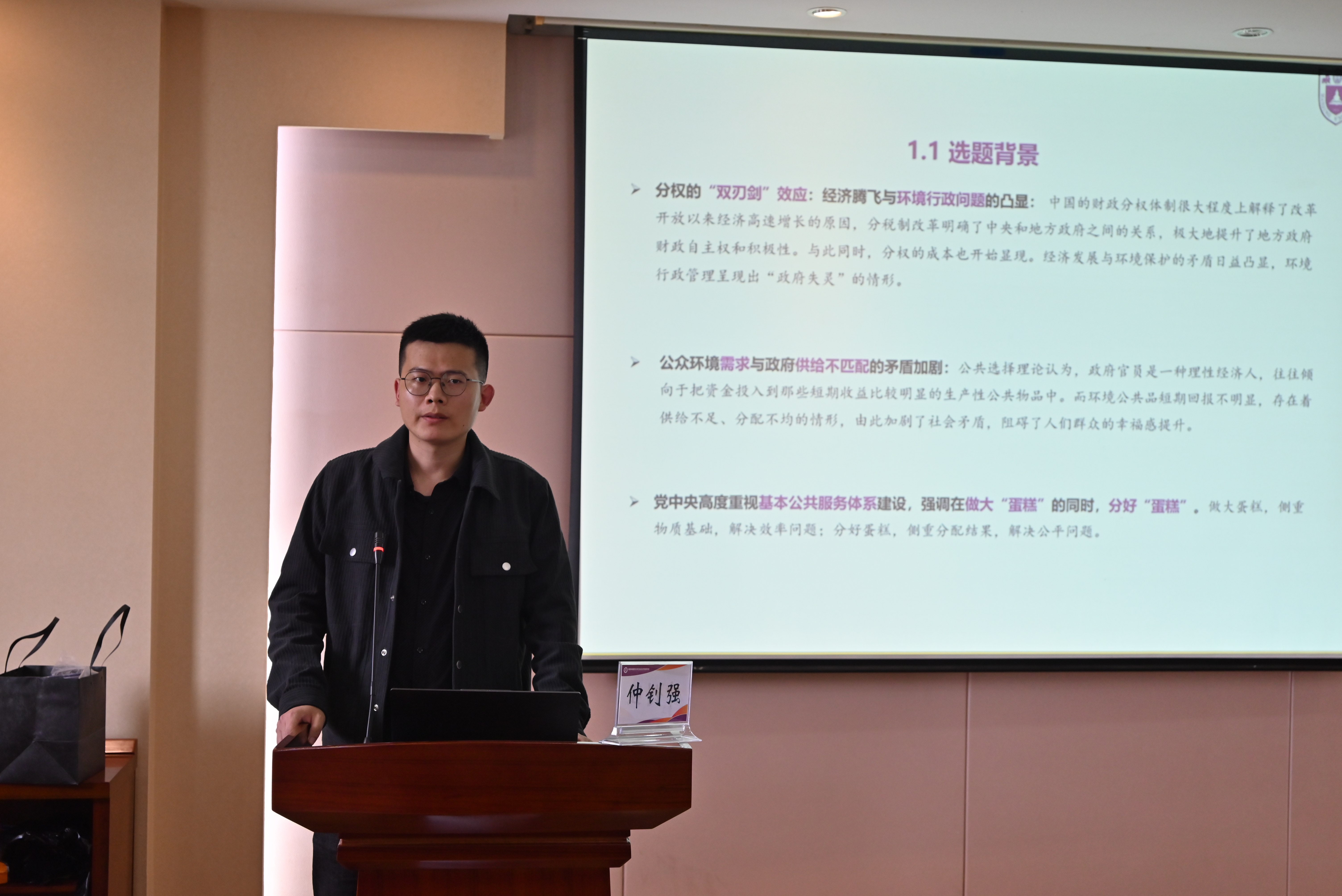 仲钊强博士以《财政分权对环境公共服务供给的影响研究》为题,向与会师生详细介绍财政分权制度的演变历程、中国式财政分权的主要特征,并以财政分权为切口,从效率与公平的视角对中国特殊的财政分权体制与环境公共服务供给之间关系进行剖析,并围绕地方政府竞争及行为偏好在二者关系中起到的作用这一主题和与会师生展开讨论。
