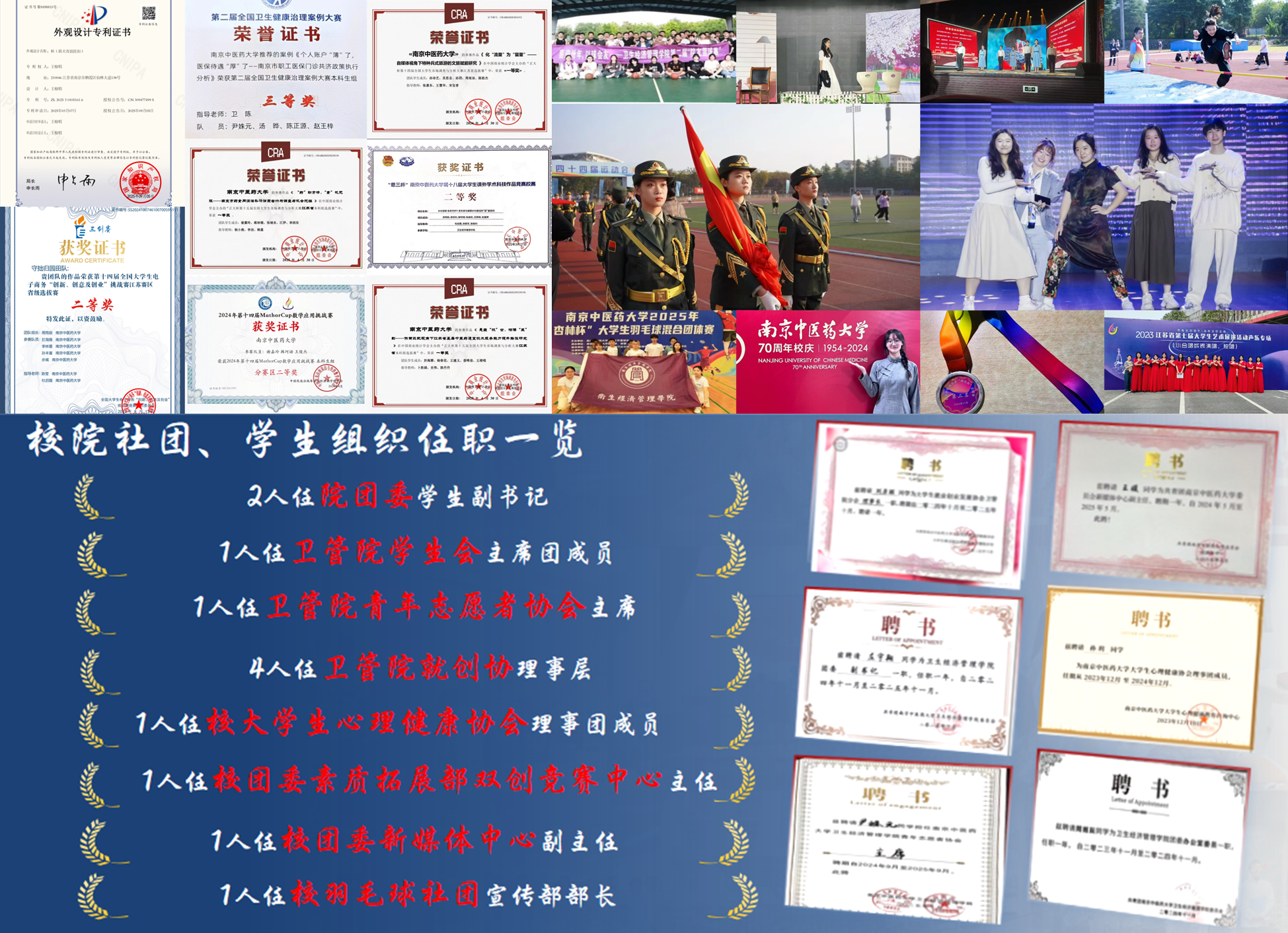 此外,同学们在学科竞赛及其他竞赛活动中屡创佳绩,累计获奖150余项。闪耀于各大文体活动舞台,共获省、校级荣誉各5项,院级荣誉2项,为校院文体事业作出贡献。19名同学在校院各级学生组织及社团中担任关键职务,他们以实干奉献自我,为学校与学院的蓬勃发展持续贡献着“公管222”的智慧与力量。