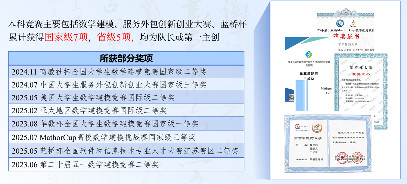 学科竞赛上,他累计获国家级奖项7项,省级5项,均为队长或第一主创。