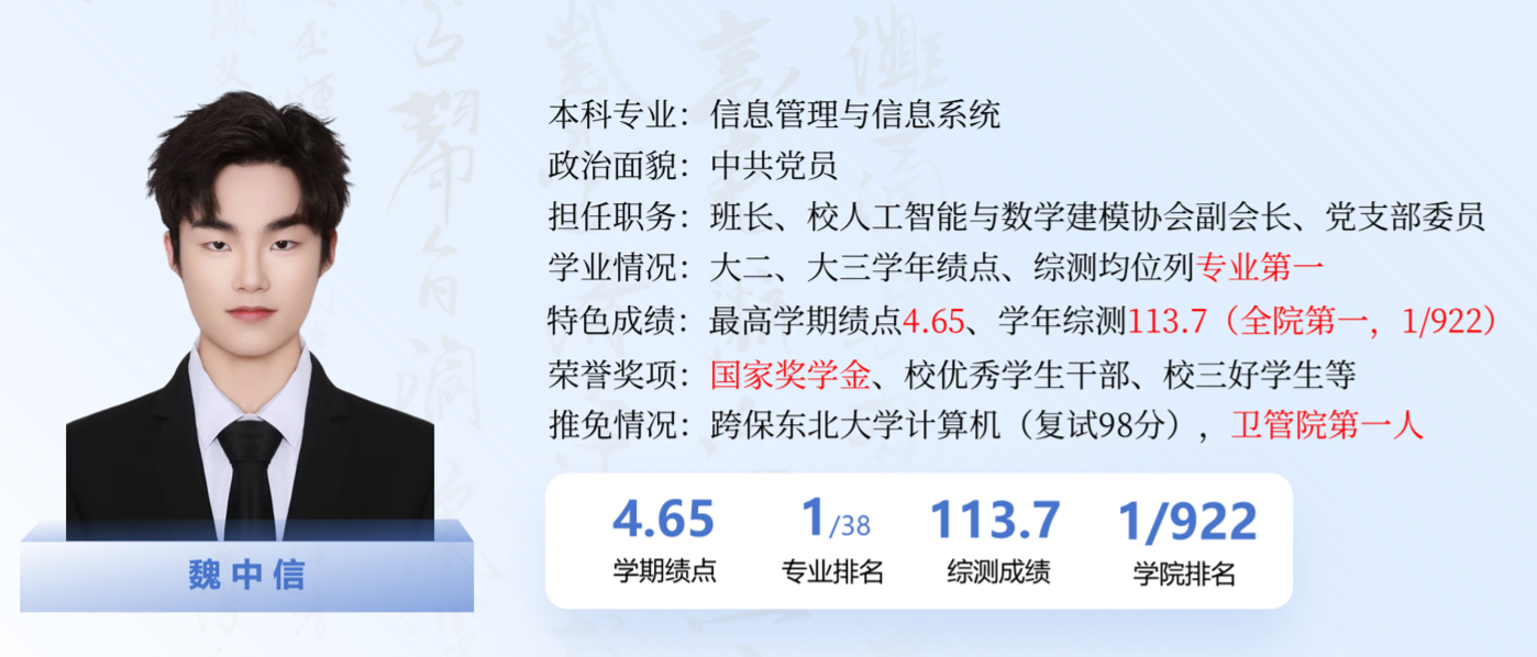 专业学习上,他连续两年绩点和综测均位列专业第一,最高学期绩点4.65,学年综测113.7,位列全院第一。此外他通过Python二级、数据库技术三级等计算机等级考试,曾获国家奖学金、校优秀学生干部等荣誉,现以复试98分的成绩成为跨保至985计算机的卫管院第一人。