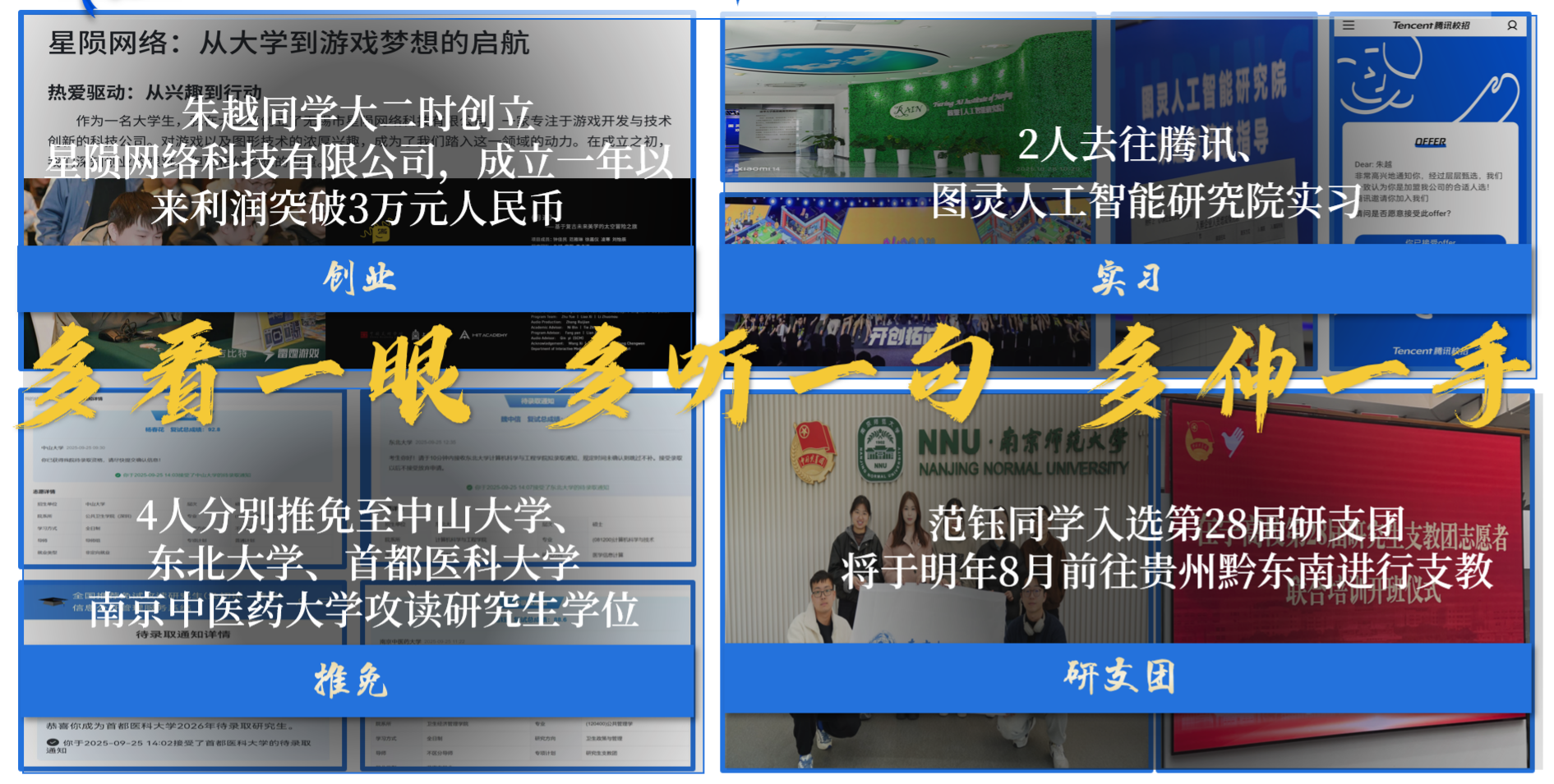 22信管班的强,是百花齐放的强;他对班级的信,是相互成就的信!有人大二创立公司,2人赴腾讯等高新企业实习,4人推免至中山、东北大学等名校,1人入选研支团赴基层奉献,这份“各美其美、美美与共”是对他在平时工作中“多看一眼、多听一句、多伸一只手”最珍贵的肯定。