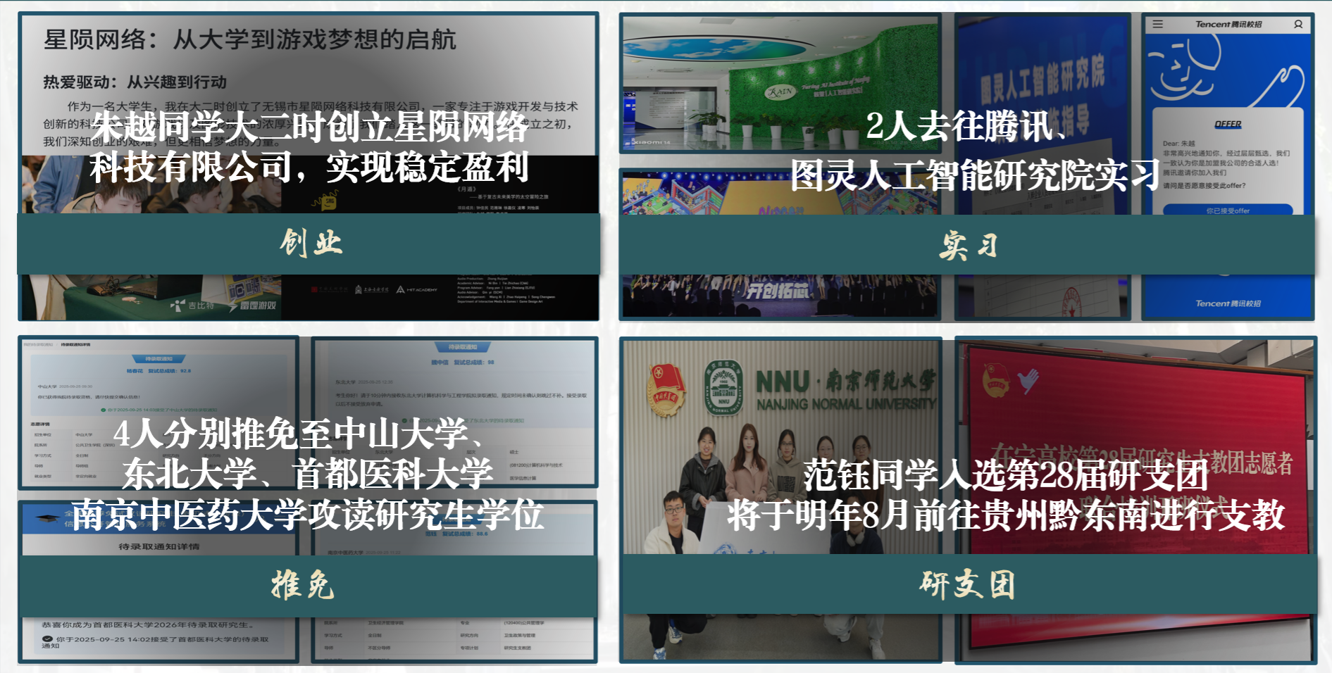 奔涌的江河,终要走向辽阔。班级朱越同学将专业所学付诸实践,其自主创立的公司开发游戏并上线Steam平台,实现稳定盈利。此外班级已有2人去往腾讯、图灵人工智能研究院等国内头部企业实习。4位同学推免至中山大学、东北大学等高校深造,其中范钰同学入选第28届研支团,即将奔赴贵州黔东南支教,继续将热爱洒在祖国大地上。