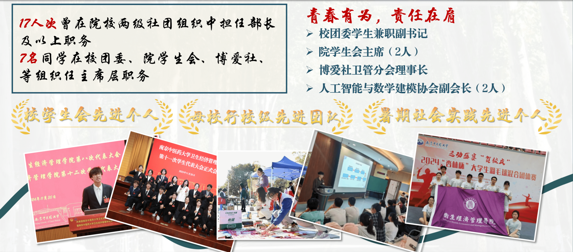 与此同时,班级共有17人次曾在院校两级社团组织中担任部长及以上职务,其中7人在校团委、院学生会、博爱社、人工智能与数学建模协会、校主持礼模队等组织任主席层职务,为学校与学院的建设贡献了鲜明的“信管力量”!